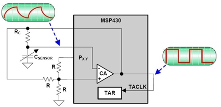 MSP430的内置比较器和外部的冲放电电阻Rc以及感应电容Csensor一起构成了一个张驰振荡器结构.而感应电容Csensor就是这个振荡器的调协元件,Csensor的任何变化都相应的改变张驰振荡器的谐振频率.我们利用MSP430内置的定时器A来采样振荡频率,从而可以检测到Csensor的变化。