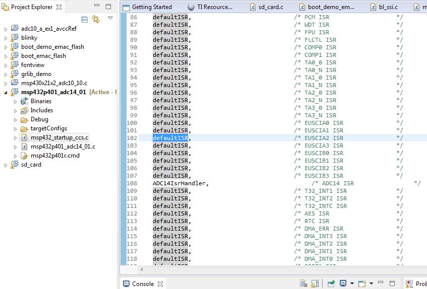 然后在startup_ccs.c中用extern void ADC14IsrHandler(void); 做下声明,表示这个函数是在别的地方定义了。