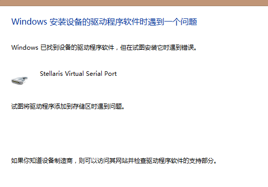 我是win8.1专业版系统 今天安装TM4C123GH6PM 的驱动程序时 驱动是官方下载的 但是有一个安装出现错误 提示试图将驱动程序安装到储存区时出现错误 但另外两个可以正常安装 且可以正常烧录程序 只是串口调试不能进行