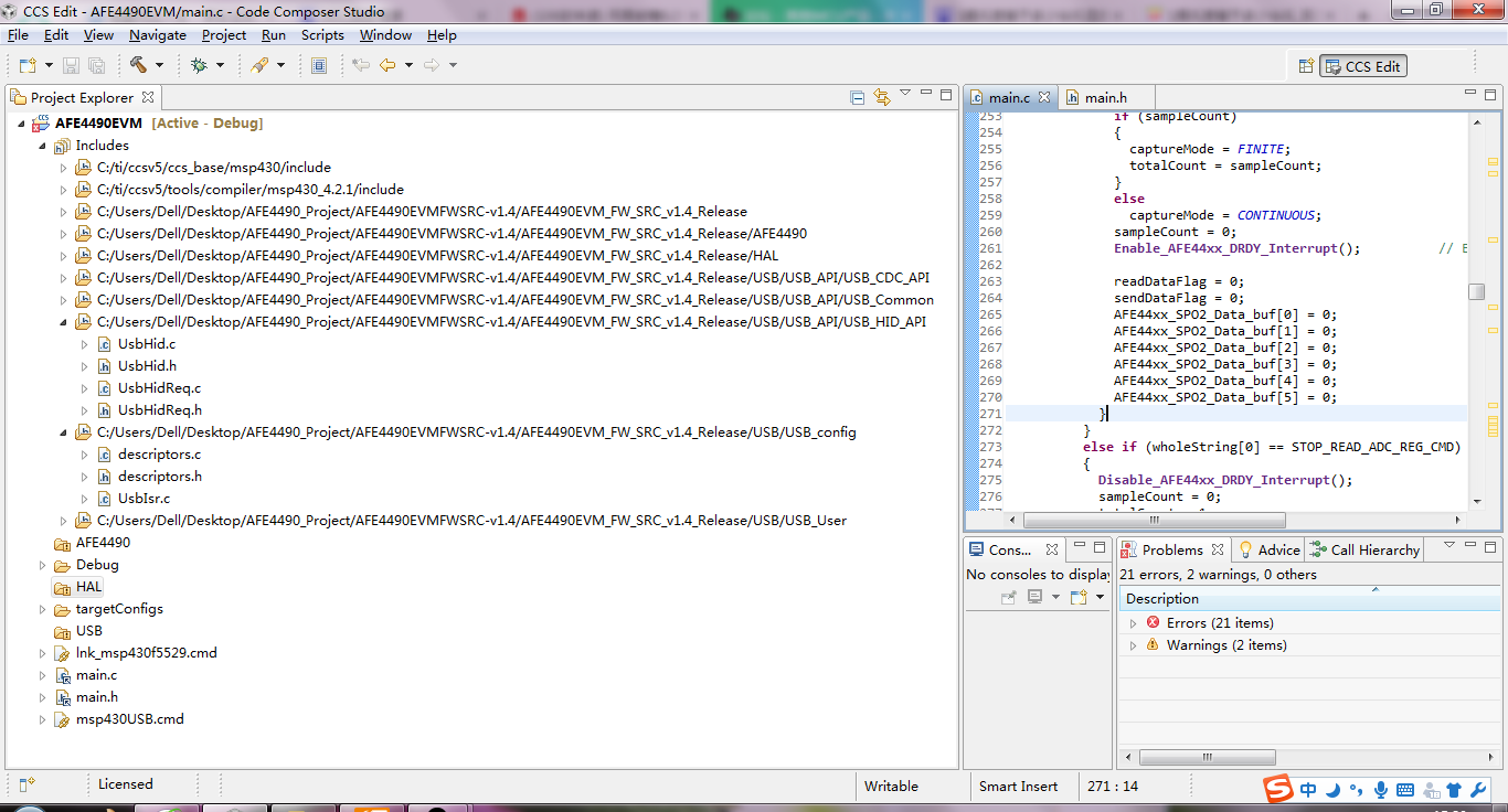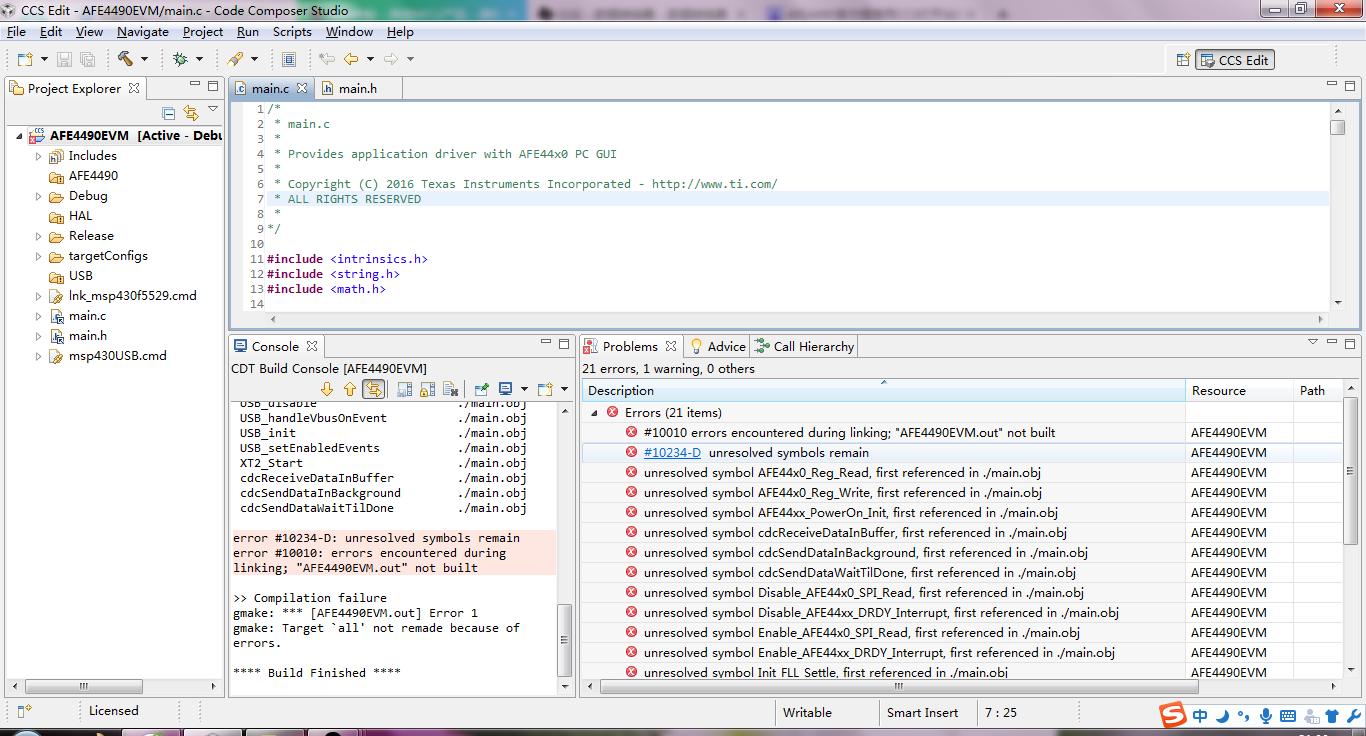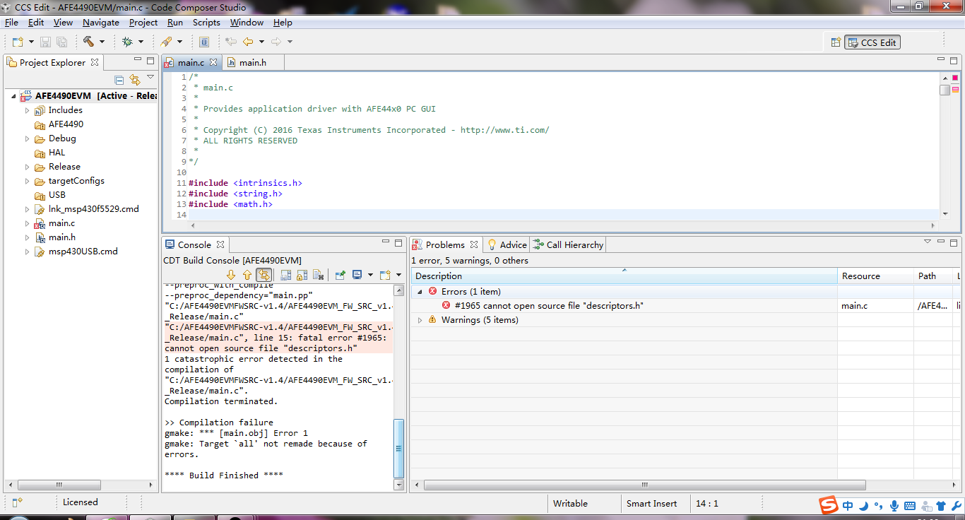 1 catastrophic error detected in the compilation of "C:/AFE4490EVMFWSRC-v1.4/AFE4490EVM_FW_SRC_v1.4_Release/main.c".