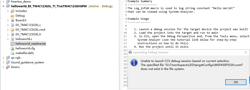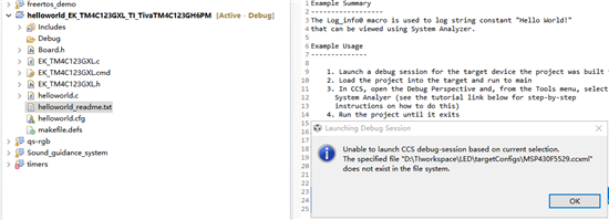 你的工程不对吧,TM4C的工程,怎么用的是msp430的.ccxml文件呢,你重新导入官方的例程看看。
