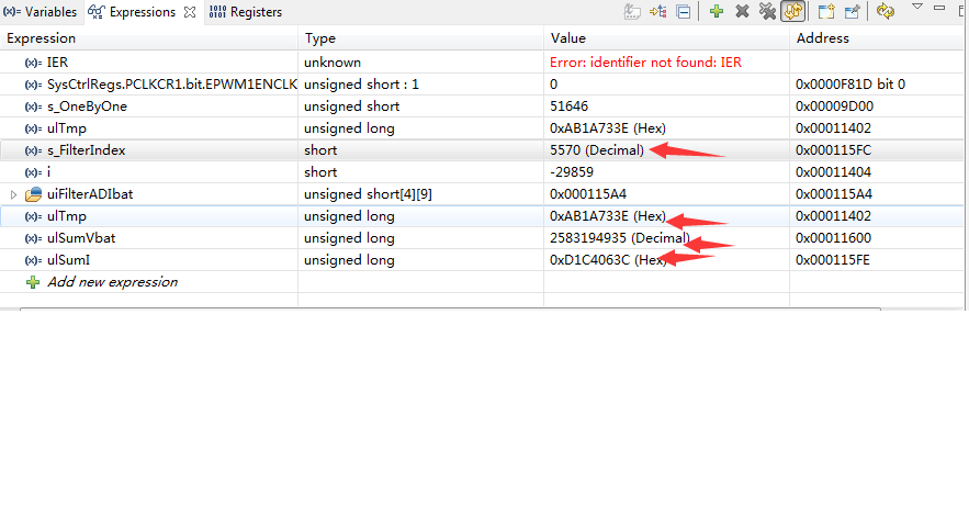 在单步调试28069的CLA程序时,发现expression里面的数据都是一场的,如