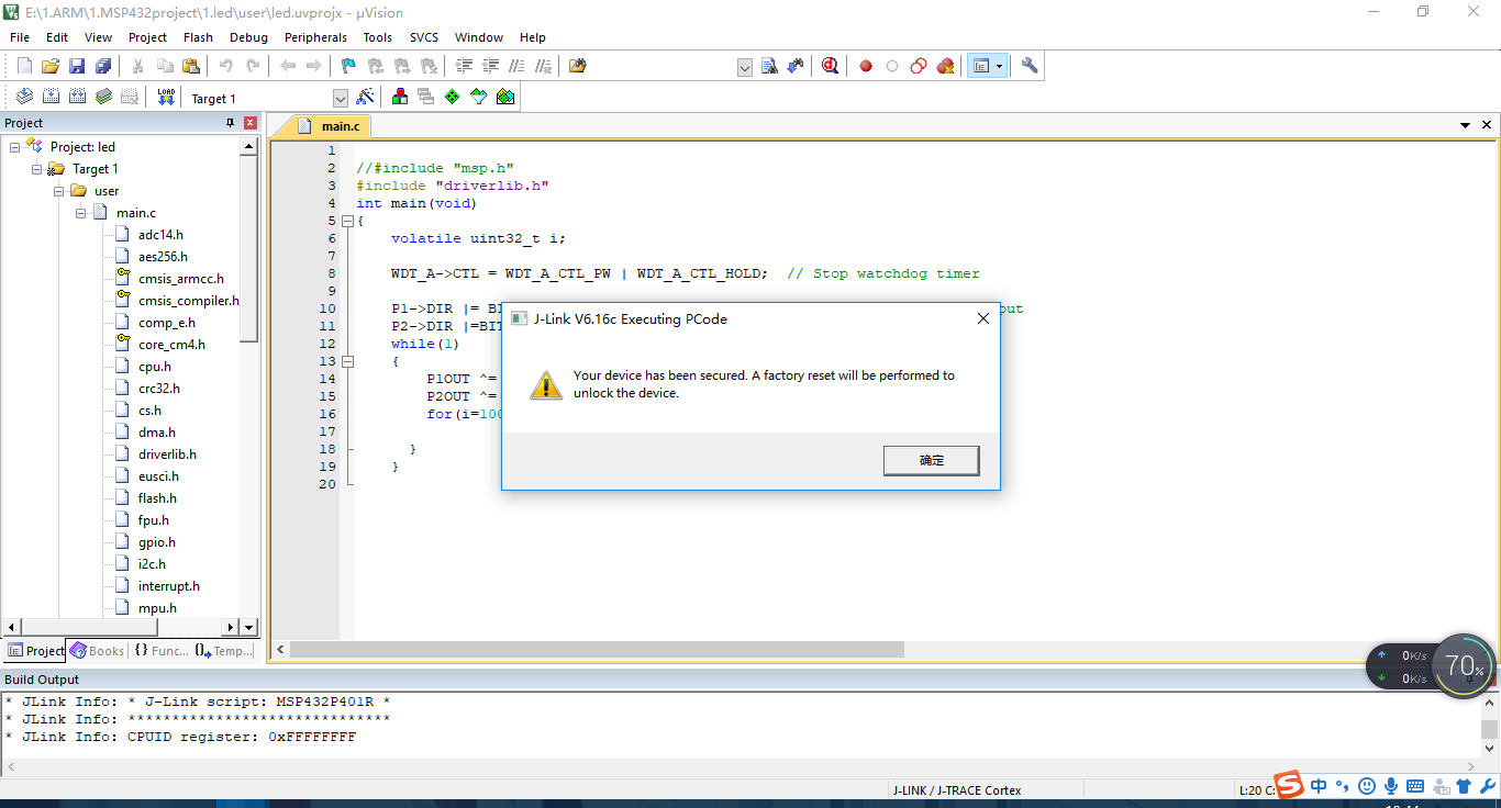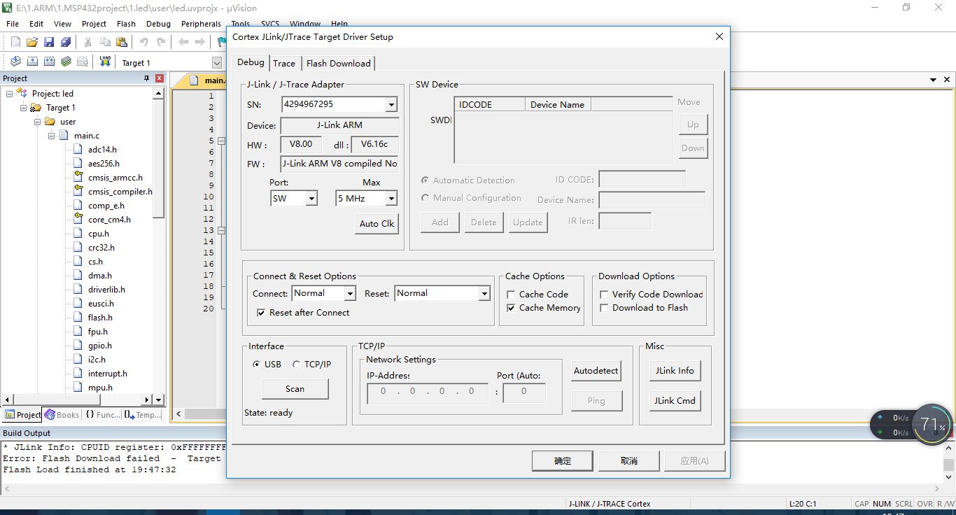 MSP432开发板自仿真器,但是我用KEIL mdk 调试时却特别的卡,于是我想试试J-LINK V8  的 swd 烧写方式,但是就出现了如下的问题,我参照了TI官网关于KEIL MDK 和J-LINK 的配置教程,但是却出问题了,在网上找了好久都没把问题解决,把j-link V8 的固件都刷了两遍都还是不行,请问是什么原因呀?