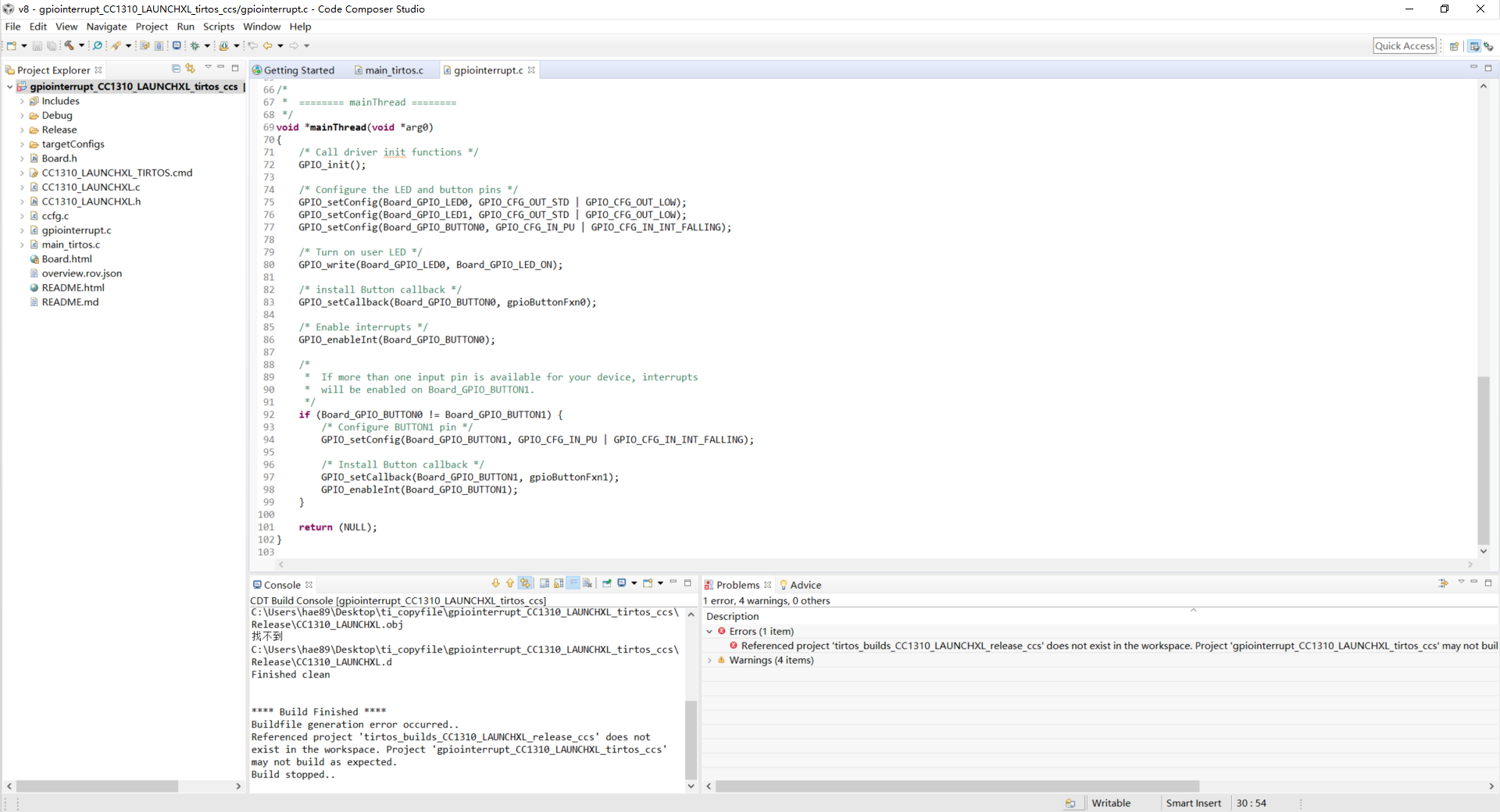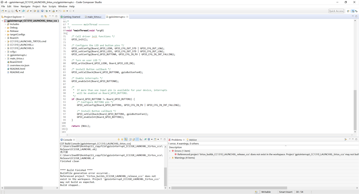 Referenced project 'tirtos_builds_CC1310_LAUNCHXL_release_ccs' does not exist in the workspace. Project 'gpiointerrupt_CC1310_LAUNCHXL_tirtos_ccs' may not build as expected.