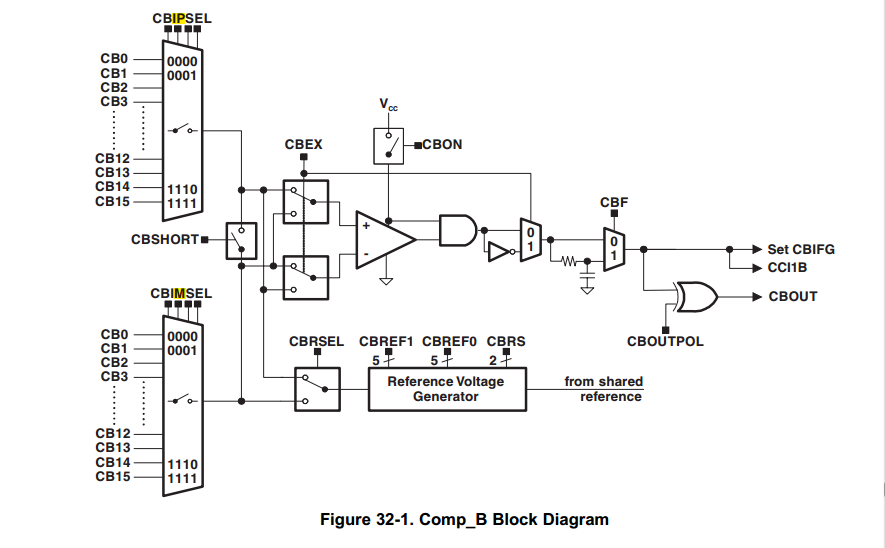 CBINT |= CBIE + CBIES; // Enable CompB Interrupt on falling edge of CBIFG (CBIES=1) 3.3 ---> 1.15