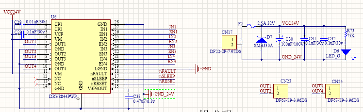 应用电路为上图所示,当24V的正负极分别连接VCC24V与GND,使GND_24V浮空时,DRV8844PWP发热非常严重,用热成像仪观察温度会成直线上升,有一百多度,请问各位这是怎么造成的。