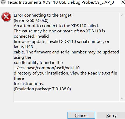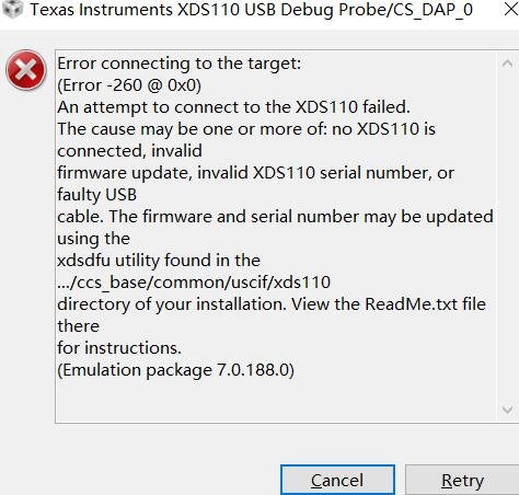 黑色板子出问题后,红色的板子也不能连接电脑了,插入时设备管理器没有更新新设备,但LaunchPad引脚的电压和指示灯全都正常。换过电脑和数据线也不能连接。一直报下面的错