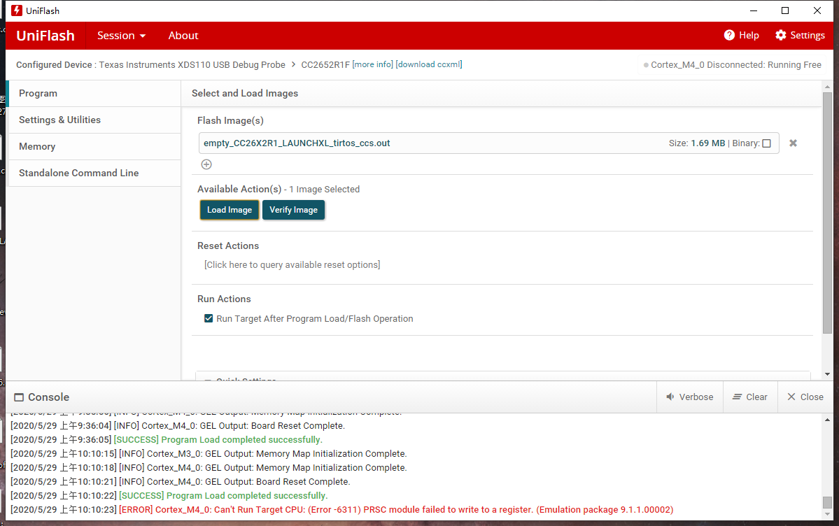 使用的sdk为simplelink_cc13x2_26x2_sdk_4_10_00_78,使用的例程为rtos中的empty工程,在该工程中,我定义了一个数组,unsigned int EE[832];编译没有出错,但是使用uniflash下载程序后,出现