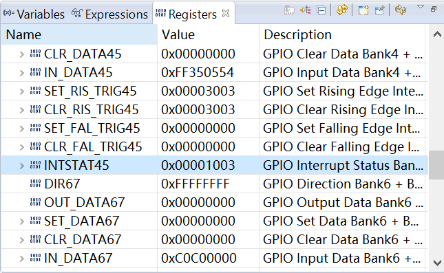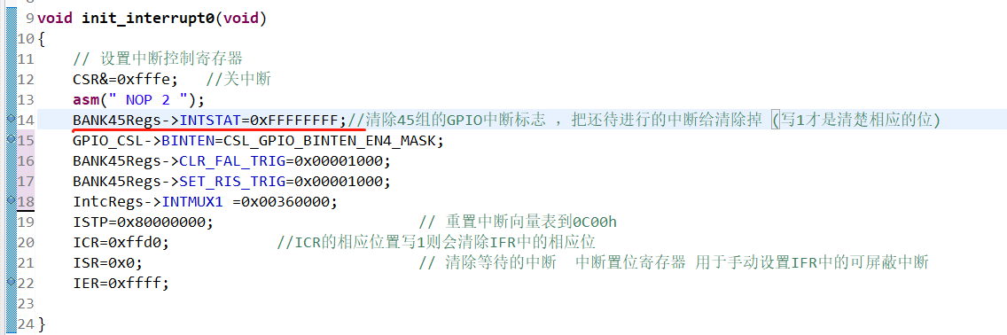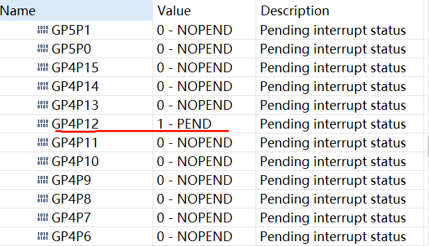 4.但是通过在线仿真查看响应的INTSTAT45寄存器中可以看出GP4P12对应的中断标志位一直为1,将程序从头开始执行,到中断初始化函数后,通过BANK45Regs->INTSTAT=0xFFFFFFFF;操作后标志后仍然为1,按道理进入中断初始化函数后程序应该没有中断了,通过往寄存器INTSTAT45里面写1应该可以清空标志位的啊。