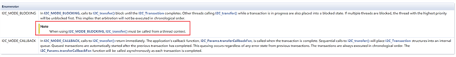 在I2C_MODE_BLOCKING 中,调用I2C_transfer() 会阻塞,直到I2C_Transaction完成。在事务进行中调用I2C_transfer() 的其他线程也被置于阻塞状态。如果多个线程被阻塞,则优先级最高的线程将首先被解除阻塞。这意味着仲裁不会按时间顺序执行。