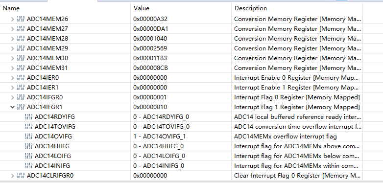 在正常跑程序时,当我将GPIO7-1置0时,如果此时初始化打开了UART-A3的话,会导致ADC连续采样停止,查看寄存器报的是ADC14MEMx 溢出中断标志为1,中断挂起了,如下图所示。