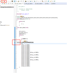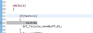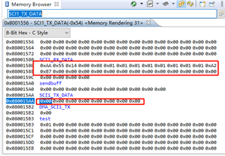 但是存在一下问题,当我将程序停在断点处时,数据发生了改变。同时程序不会运行到SCI_TX(sendbuff,8)处如图: