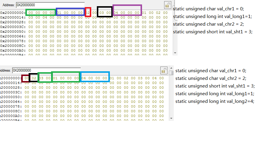 但也有情况是变量占用空间和分配空间不一致的情况,例如上面的 short int 变量,就占用了4个位置,在后面定义的long int 变量就要跳过X20000006-0X20000007两个位置。用户如果在定义char 或short 变量,由于编译器会优化空间,所以把在6-7的位置分配给新定义的变量。