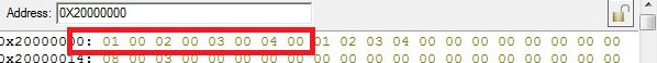 其中红色标注部分是变量占用空间,0x20000000-0X2000000B 是为这些变量分配的空间。