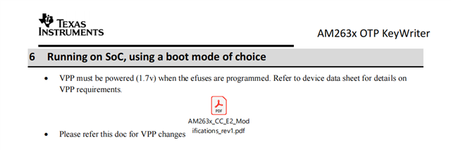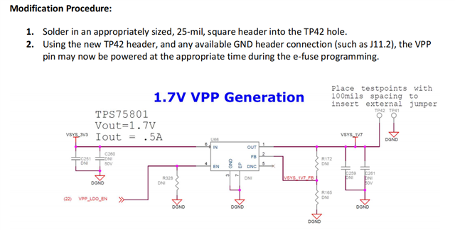 在使用AM2634-CC开发板集成OTP Keywrite功能,需给VPP供电,文档描述为给将TP42连接到地线,如下图所示: