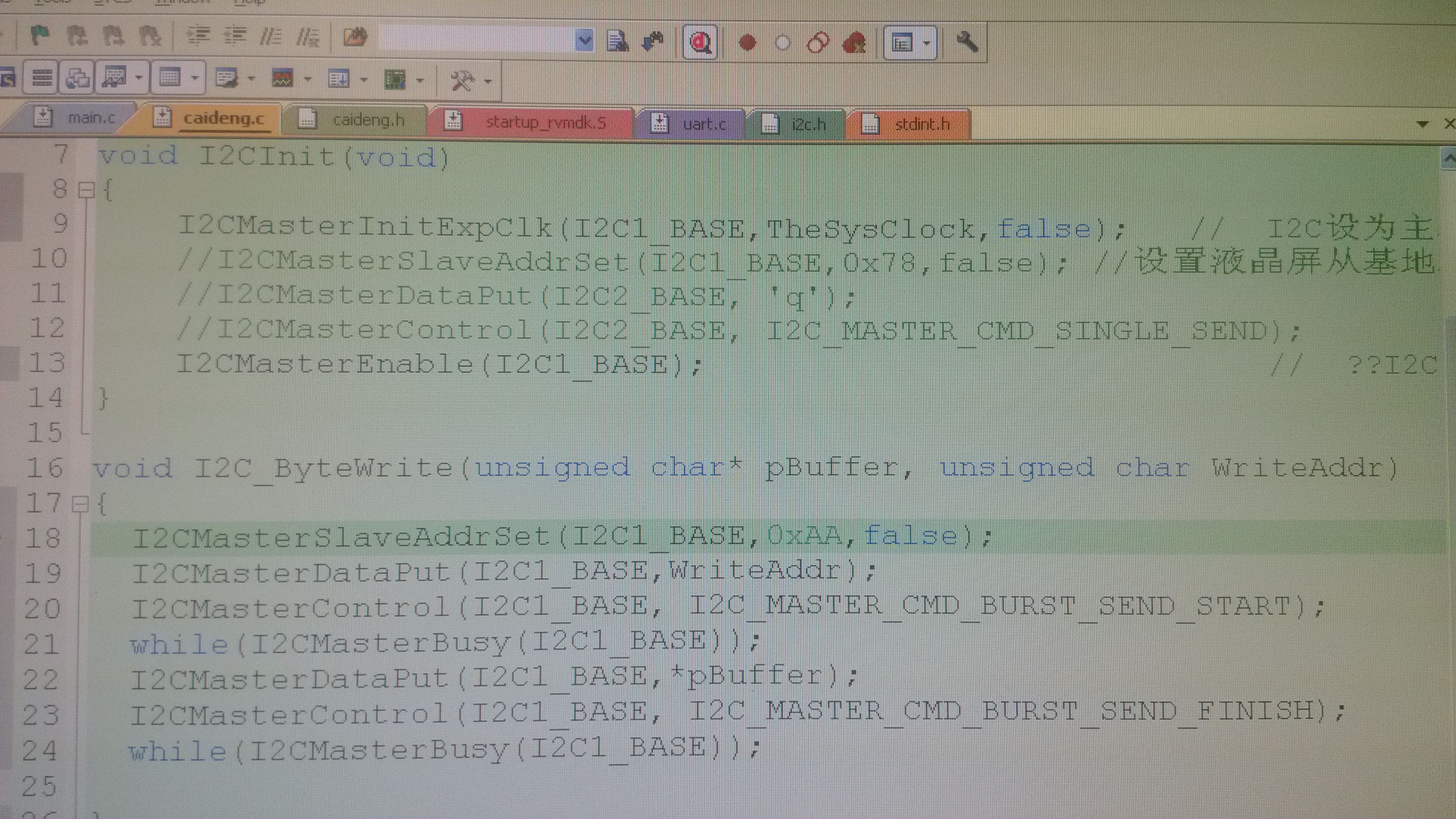 想要控制液晶屏,如附件所示I2C设置,这样总是调试不通过,又不知道如何检查,其中0XAA是从机地址,WriteAddr为子地址,*pBuffer为要发送的内容,想知道I2C是这样设置的吗,我看例程都是用中断进行发送的,不用中断可不可以,是不是图中代码的顺序。