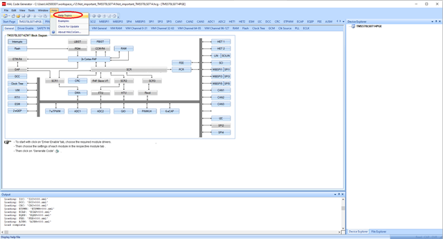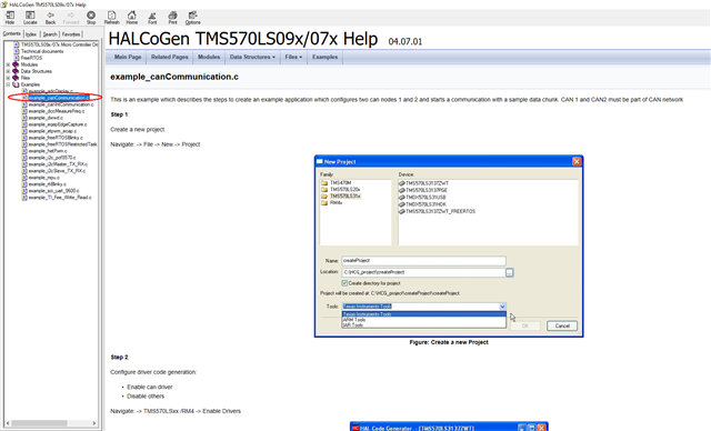 HALCoGen 中有一个 TMS570LS0714的 CAN 示例。 您可以通过点击Help->Help Topics来访问此功能: