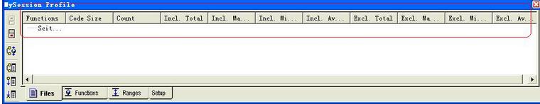 这个窗体中,有四个选项卡,其中Files为以源文件列出统计数据,Functions选项卡用于剖析程序中的函数,Ranges用于剖析一段连续的代码,Setup用于设置开始点和结束点,用于剖析不连续的代码。