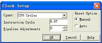 2. 选择Profiler菜单下的 clock setup子菜单,并在Instruction Cycle中输入你的DSP时钟周期,它的单位为纳秒,例如,2407的系统时钟为40MHz,你就该填入25,如果是2812系统时钟为150MHz,就该填入6.67ns,其他配置不动,然后确定。如图所示。