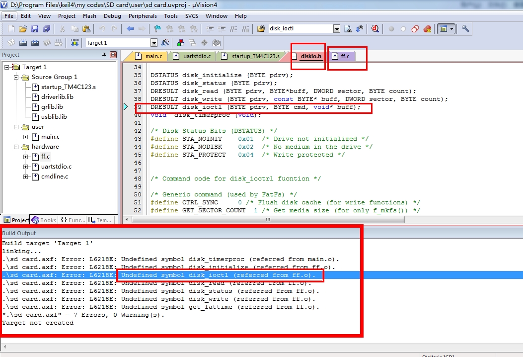 我用的keil4编译测试的SD卡部分的代码,有错误提示,原来是没有找到diskio.c文件,我是用的TivaWare_C_Series-2.1.0.12573版本的库文件,然后我到