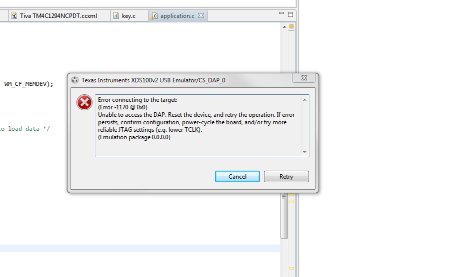 大家好,我现在使用TM4C1294NCPDT这款芯片,仿真器使用的是XDS100-v2连接,第一次能成功并且能够烧录进去,但当我一运行就中止了,然后就只能点停止。再然后我下电重新再连接始终连接不上了,显示的结果如图