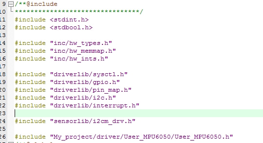 我使用的是1.0版本的库,我在MPU6050初始化的用户.c文件中加入i2cm_drv.h(倒数第二行),然后出现了符号定义的问题: