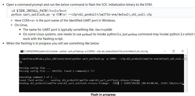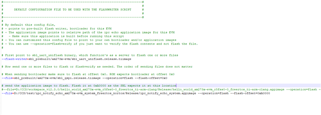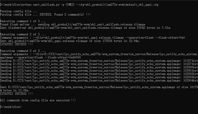 尝试操作:参考资料,对AM2732的板子进行进行了固件的烧写,固件有试过hello_world_am273x-evm_r5fss0-0_freertos_ti-arm-clang工程的单核固件,也试过多核工程ipc_notify_echo_am273x-evm_system_freertos_nortos的多核固件,固件分别为hello_world_am273x-evm_r5fss0-0_freertos_ti-arm-clang.appimage 和 ipc_notify_echo_system.appimage。用python脚本,成功的对固件进行了烧写,但是重启后串口无任何打印