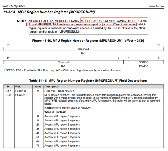 2,MPUREGNUM寄存器中描述的MPUREGAM0-7,MPUYREGTA0-7,MPUREGMT0-7在该寄存器字段和NMPU上下文中未提及。