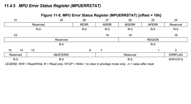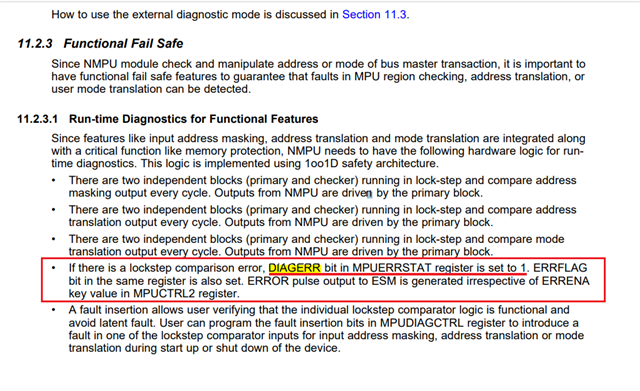 在NMPU章节描述中,提到在NMPU锁步比较错误时,可将MPUERRSTAT寄存器中DIAGERR置为1,但查询MPUERRSTAT寄存器描述后发现,该寄存器字段内无DIAGERR位描述。