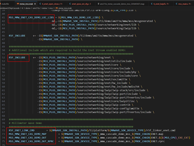 我使用的SDK是mmWave2ChipCascade,主要修改了mmWave2ChipCascade\ti\demo\am273x\mmw\路径下的makefile文件以及.\mms\mmw_mss.mak文件,大致修改如下: