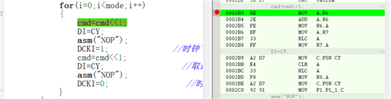 右边汇编代码显示,一个左移位指令,和赋值语句, 用了这么多条指令,而且调试结果显示 DI = CY 这个赋值不成功(CY=1,但是赋值之后DI=0)