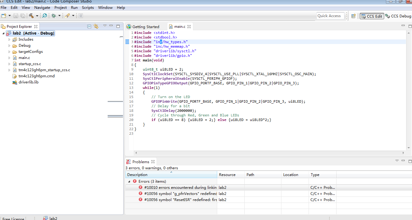 #10056 symbol "ResetISR" redefined: first defined in "./startup_ccs.obj"; redefined in "./tm4c123gh6pm_startup_ccs.obj" lab2 C/C++ Problem
