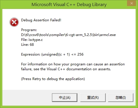 INTERNAL ERROR: D:/ti/ccsv6/tools/compiler/ti-cgt-arm_5.2.5/bin/armcl had an internal inconsistency and aborted