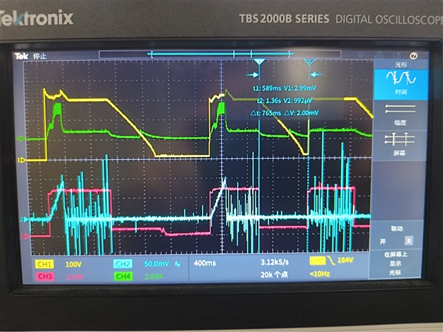 从波形图中可以看出,第二次上电时未激励,直接进入保持状态(电流波形为保持电流),且在第二次上电时EN脚已低于1.3V,处于低电平状态,芯片的电源电压也已降至0V,在第三次上电时间隔是将更长一些后才能够正常激励。