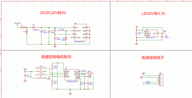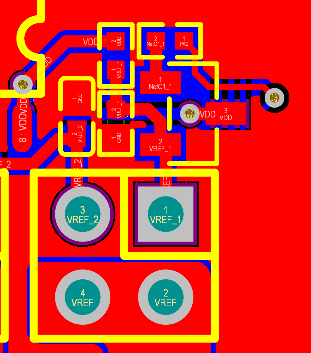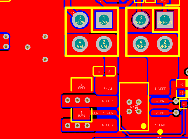 上边是芯片的LAYOUT,下边则是采取的IO口限制启动电流(当前没有使用),只是对两电阻进行分压,然后由跳线选择VREF_1,进入DRV8870的4脚VREF,(VREF_2是采取的PWM转DAC,通过限制电流实时控制扭力大小暂且不管),希望尽快回复,谢谢