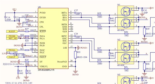 最近一批使用DRV8328BRUYR发现芯片莫名其妙坏了,有些首次是通电发现产品静态电流偏大10mA不到,有些静态电流也正常。烧录CPU控制程序后,再次上电发现芯片短路报警,有的nFAULT有报警指示输出,有的直接无报警指示输出,但给控制信号芯片无输出。我们1台产品用2颗芯片(控制5路半桥),1颗3路输出均用,1颗用2路。用2路输出坏的概率更大。最近测试时输入电压为18V并作了限流控制,但问题还是存在。