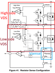 因此,这两种保护功能的功能相同,但具有不同的阈值和不同的测量位置。 Vsense 是在 SPx 和 SNx 引脚上测量的(Rsense * 电机电流)。 下图可能有助于区分每个测量在半桥上的位置: