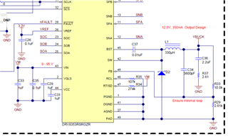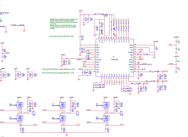 我们使用DRV8323RH,设计如附件图片所示,我们使用芯片内部buck输出3.3V给MCU供电,上电电机没转的时候,这个3.3V波形相对正常,但是在高转速的时候,3.3V波形干扰就很大(高的瞬时可以4V)了,因此想请教下有什么好的建议可以让DRV8323RH芯片自带的buck输出电源不受此干扰,外部mcu是否可以使用这个buck输出电源?(layout 中输出的3.3V电源与+VBAT1相邻层无overlay)