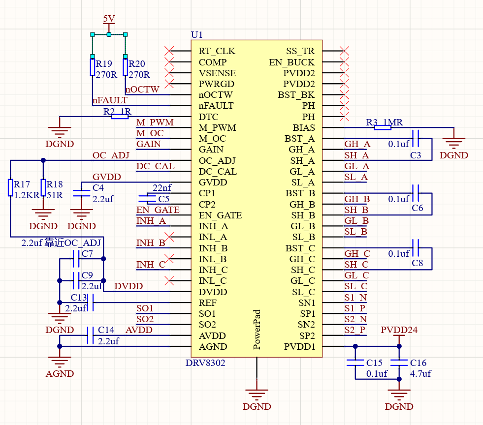 当我将DRV8302上电之后,芯片似乎不能正常启动。测得引脚DVDD、AVDD、GVDD都为0V。可能会是什么原因呢?