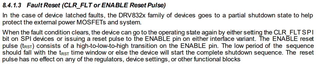 器件在启动期间,可能已经向寄存器填充了故障数据,此时两个故障都可能已被触发。 为 UVLO 条件指定故障的寄存器位一直保持设置状态、直到被Enable reset pulse(启用时的长度为8-40us 的唯一脉冲序列)或者CLR_FLT 位清除,详细信息如datasheet中所示: