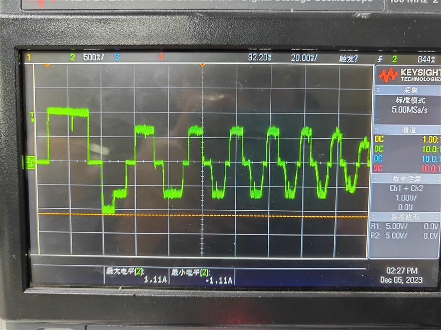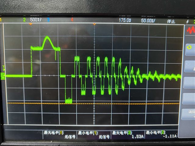 启动瞬间的电流超出设定值。启动时DRV11873会以100%占空比驱动电机,这时使用电流钳测试电流会出现如下波形: