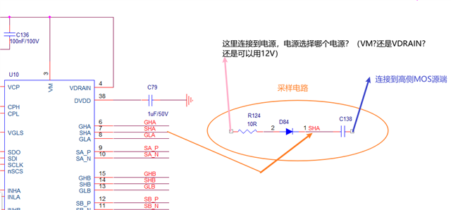 • (1)如果设计的电路需要添加自举电路,自举电路电容一端连接引脚SHX(SHA,SHB,SHC),电容另一端连接到高侧MOS,自举电路中的电阻连接到哪个电源网络呢?是连接到VDRAIN,还是VM,还是我可以连接到原理图中的12V?(设计中采用单一电源模式)