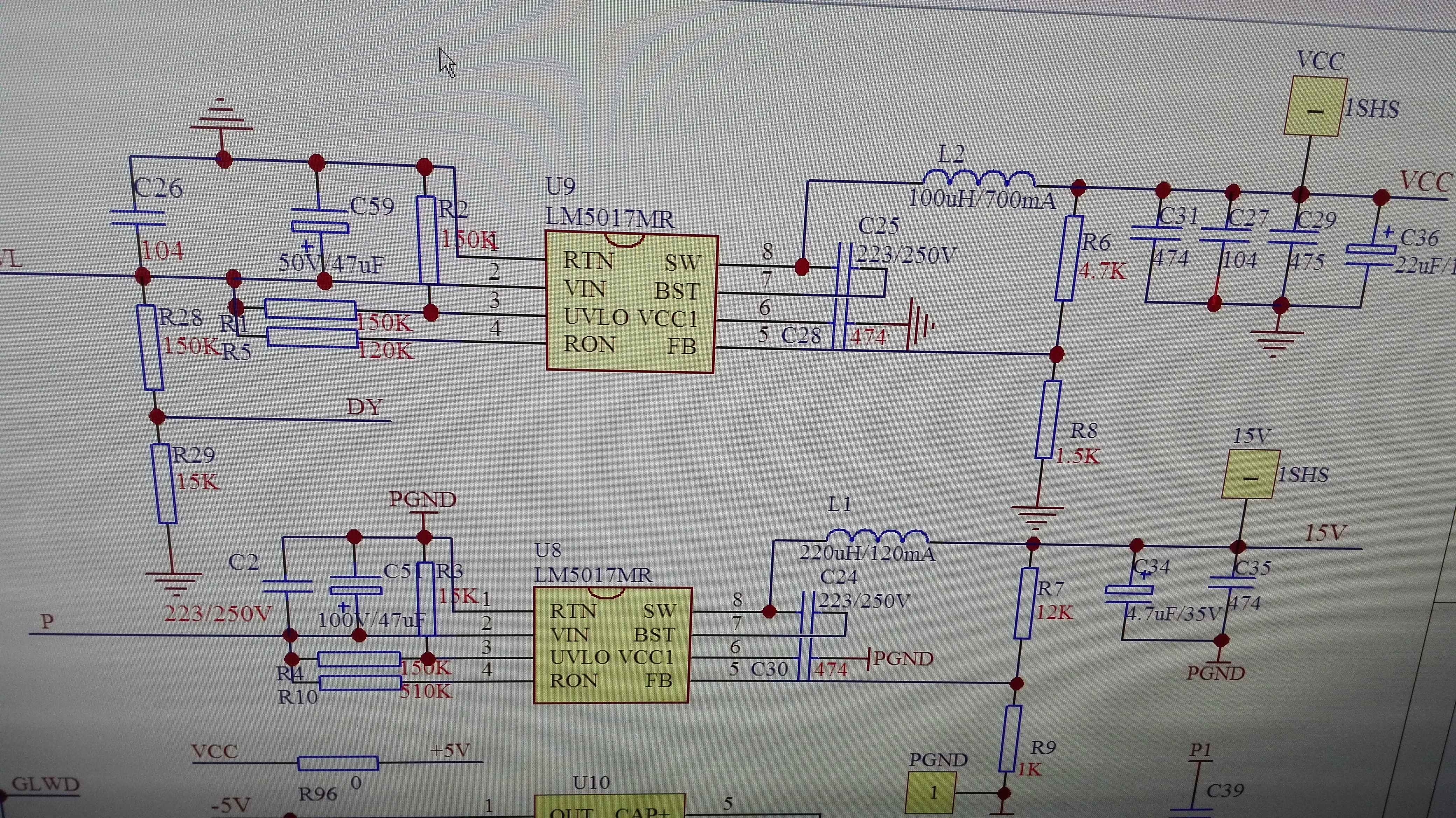 之前有发帖讲LM5017的输出波形问题一直没有得到解决。输入24-76V,输出分别为5V和15V,如果不看SW的输出波形输出还是很稳的,可是一看SW的波形,频率不是我设计的频率,总是有调节震荡。调整反馈电阻的阻值(等比例缩小)会有改善,但是15V的频率还是太高,而且会有震荡,请专家帮忙看看,到底是哪里的问题,附上电路图和波形如附件。
