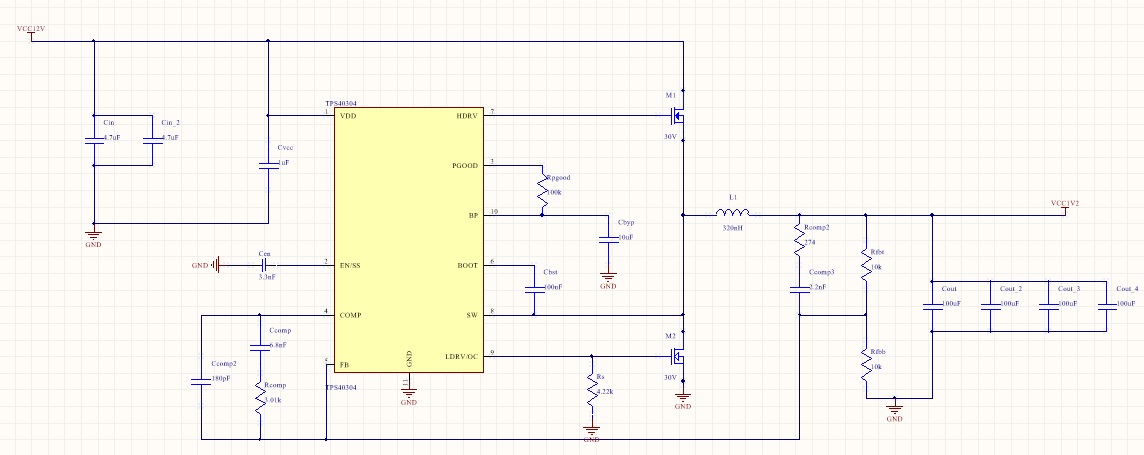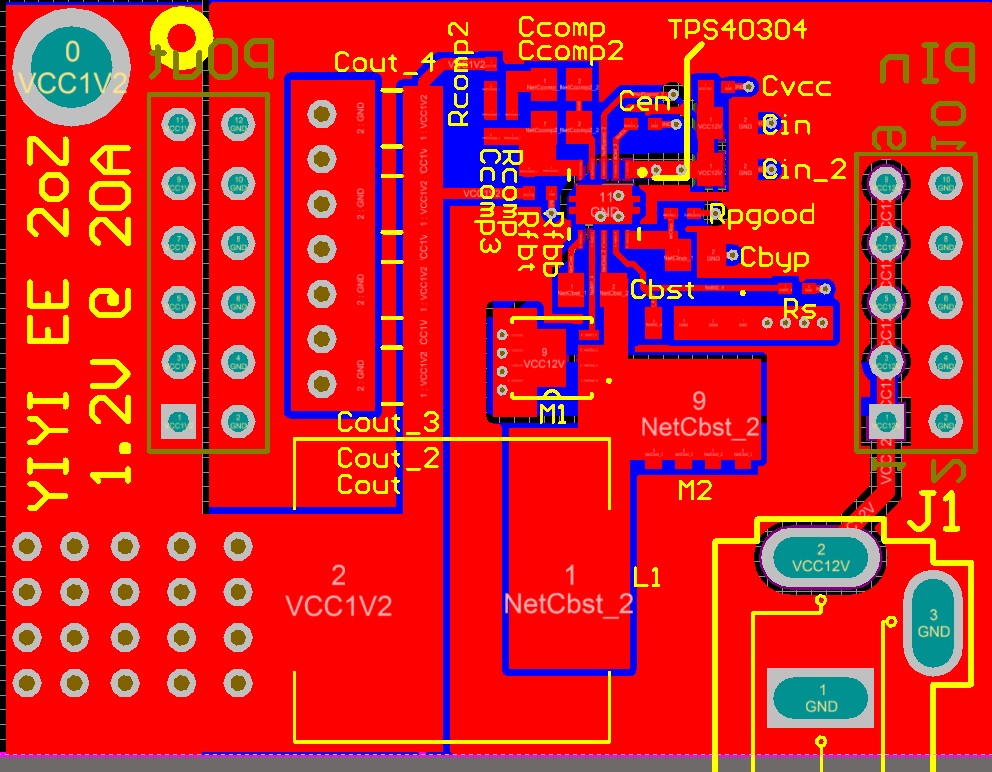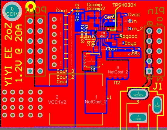 tps40304我先做成了一个小模块做测试,我想让它能输出1.2V@16A或以上的电流,现在板子好了,发现输出的1.2V有噪声,找不到问题,