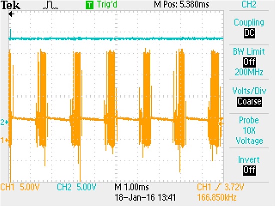 直接将24V突然加上,芯片进入保护,输出5V左右的锯齿纹波,功耗极低;