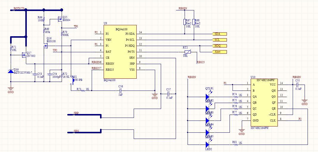 如图,使用ev2300链接bq34z100时,软件弹出如图框。但我测量REG25引脚输出也为2.5V,用逻辑分析仪分析得出,I2C波形已经出来,但是器件没有应答,原理图如下所示,原理图部分请问是否有问题?或者有其他问题?