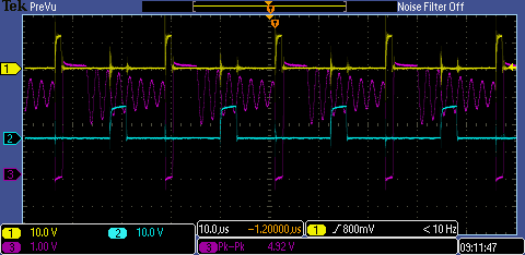 UCC28070输出的两路驱动波形的占空比不一样是怎么回事?(输入220VAC,交错PFC电感360uH,PFC输出电压396VDC,目前带载为200W)波形在附件里,通道1 和2 是GS波形 3通道(与1通道GS对应的MOS)是DS波形。