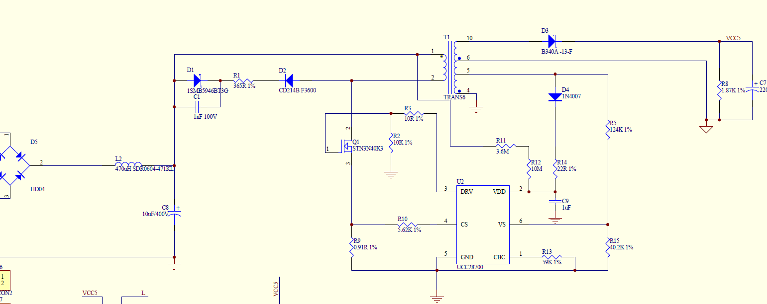 220转5V2A电路用UCC28700设计,辅助绕组无供电,求解答?