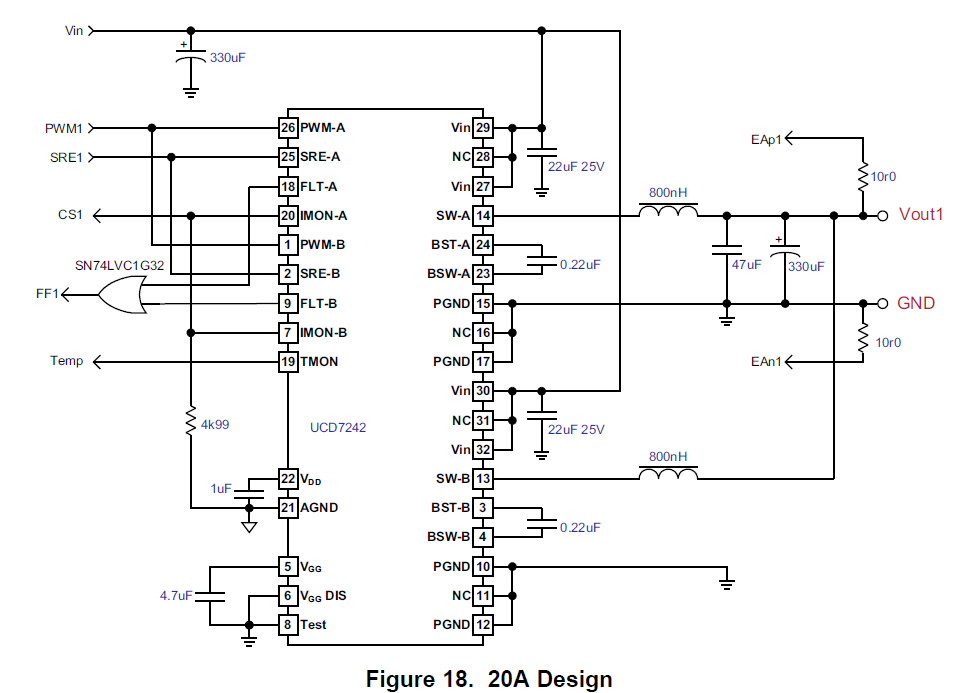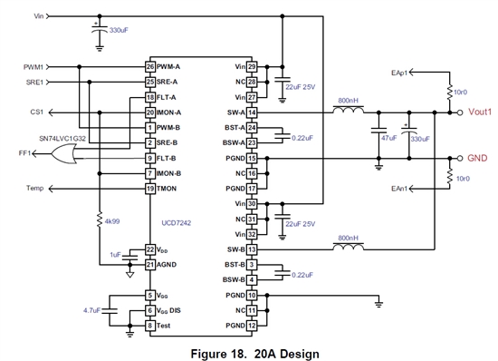我用UCD9222通道1同时控制一片UCD7242的两个通道,输出CVDD,并联最大输出20A。