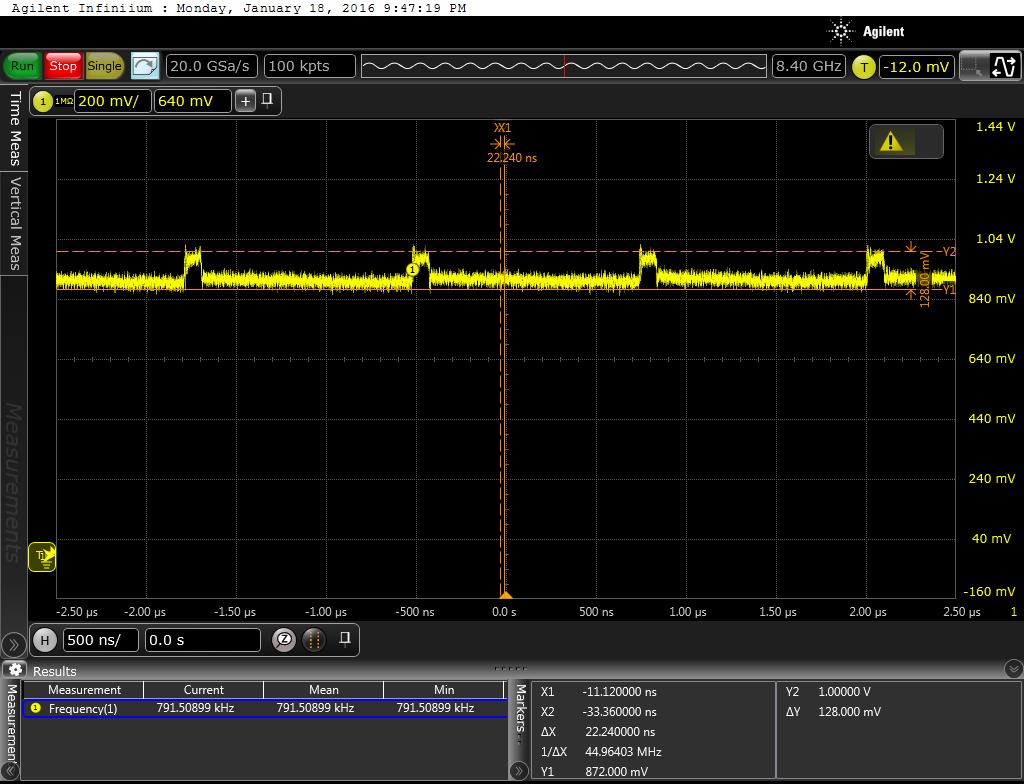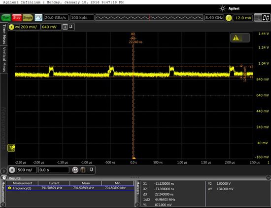 1. CVDD输出0.95V,测得纹波大概有128mV,频率是799KHz,就是UCD9222出来的DPWM的那个频率。